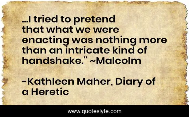 This page presents the quote "...I tried to pretend that what we were enacting was nothing more than an intricate kind of handshake." ~Malcolm". Author of this quote is Kathleen Maher, Diary of a Heretic. This quote is about indie, irreverent-humor, cult-technique, spiritual, fiction,.