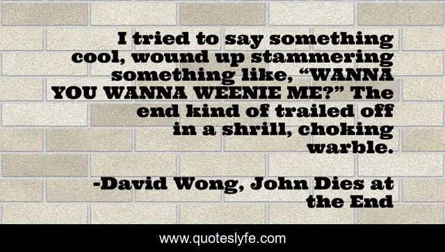 This page presents the quote "I tried to say something cool, wound up stammering something like, “WANNA YOU WANNA WEENIE ME?” The end kind of trailed off in a shrill, choking warble.". Author of this quote is David Wong, John Dies at the End. This quote is about horror, humour,.