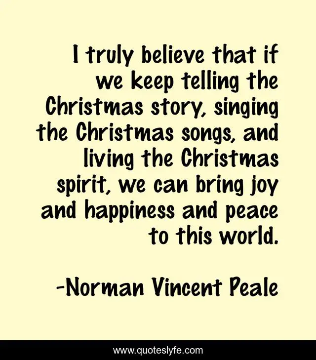 This page presents the quote "I truly believe that if we keep telling the Christmas story, singing the Christmas songs, and living the Christmas spirit, we can bring joy and happiness and peace to this world.". Author of this quote is Norman Vincent Peale. .
