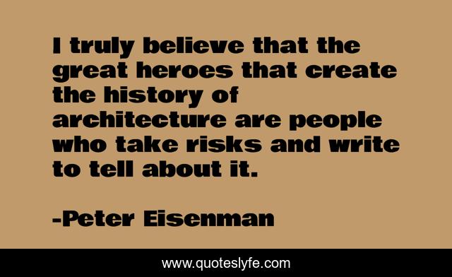 This page presents the quote "I truly believe that the great heroes that create the history of architecture are people who take risks and write to tell about it.". Author of this quote is Peter Eisenman. This quote is about great, believe, history,.