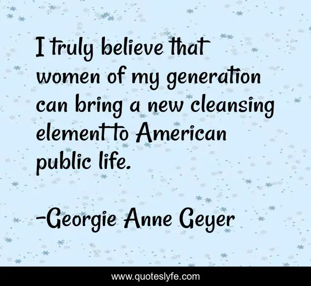 This page presents the quote "I truly believe that women of my generation can bring a new cleansing element to American public life.". Author of this quote is Georgie Anne Geyer. This quote is about self, reliance,.