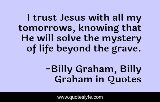 This page presents the quote "I trust Jesus with all my tomorrows, knowing that He will solve the mystery of life beyond the grave.". Author of this quote is Billy Graham, Billy Graham in Quotes. This quote is about billy-graham, jesus,.