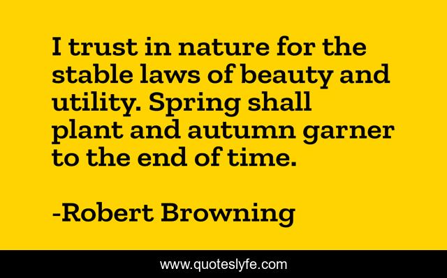 This page presents the quote "I trust in nature for the stable laws of beauty and utility. Spring shall plant and autumn garner to the end of time.". Author of this quote is Robert Browning. This quote is about autumn, beauty, time,.