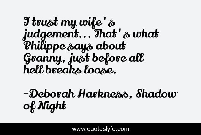 This page presents the quote "I trust my wife's judgement... That's what Philippe says about Granny, just before all hell breaks loose.". Author of this quote is Deborah Harkness, Shadow of Night. .