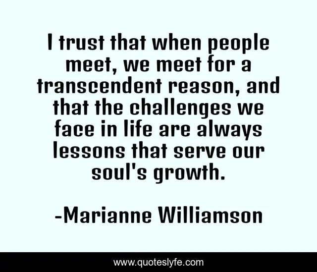 This page presents the quote "I trust that when people meet, we meet for a transcendent reason, and that the challenges we face in life are always lessons that serve our soul's growth.". Author of this quote is Marianne Williamson. This quote is about life, growth, soul,.