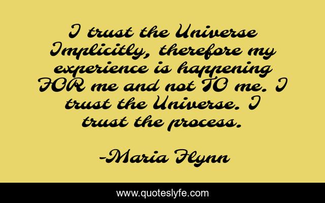 This page presents the quote "I trust the Universe Implicitly, therefore my experience is happening FOR me and not TO me. I trust the Universe. I trust the process.". Author of this quote is Maria Flynn. This quote is about personal-development, universe-knowing-oneself, universal-truths, personal-growth,.