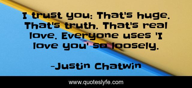 This page presents the quote "I trust you: That's huge. That's truth. That's real love. Everyone uses 'I love you' so loosely.". Author of this quote is Justin Chatwin. This quote is about i love you, trust, truth,.