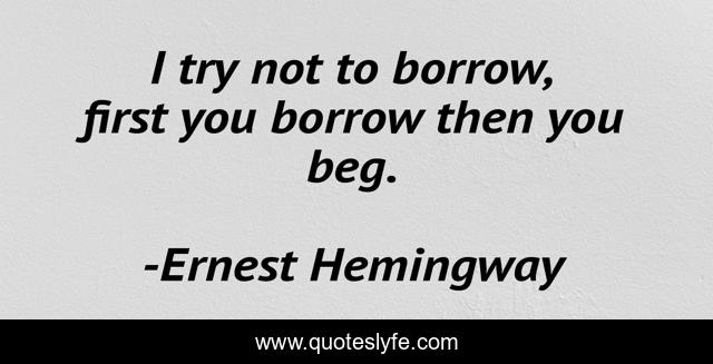 This page presents the quote "I try not to borrow, first you borrow then you beg.". Author of this quote is Ernest Hemingway. This quote is about finance, truism,.