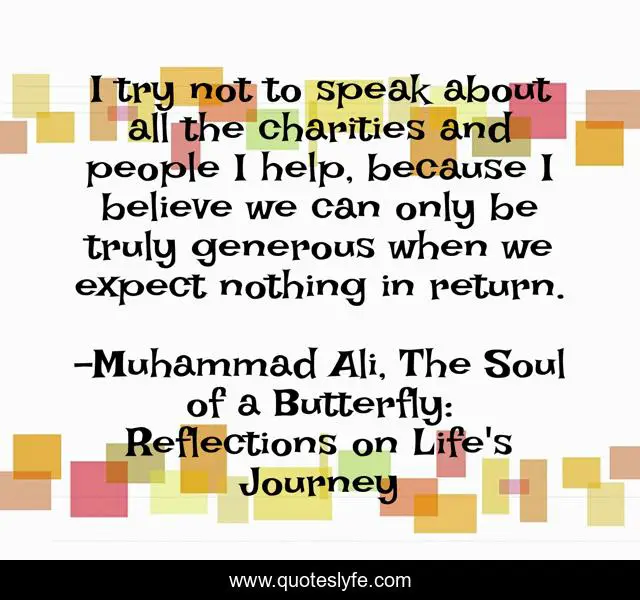 This page presents the quote "I try not to speak about all the charities and people I help, because I believe we can only be truly generous when we expect nothing in return.". Author of this quote is Muhammad Ali, The Soul of a Butterfly: Reflections on Life's Journey. This quote is about good, help, soul, generosity, goodness, muhammad-ali, charity,.