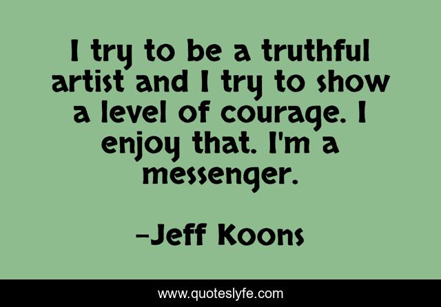 This page presents the quote "I try to be a truthful artist and I try to show a level of courage. I enjoy that. I'm a messenger.". Author of this quote is Jeff Koons. This quote is about enjoy, try, artist,.