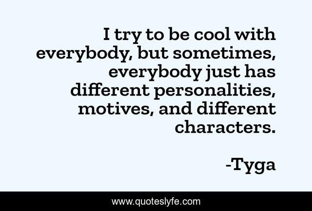This page presents the quote "I try to be cool with everybody, but sometimes, everybody just has different personalities, motives, and different characters.". Author of this quote is Tyga. This quote is about try, different, sometimes,.