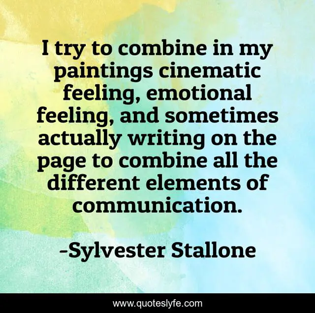 This page presents the quote "I try to combine in my paintings cinematic feeling, emotional feeling, and sometimes actually writing on the page to combine all the different elements of communication.". Author of this quote is Sylvester Stallone. This quote is about emotional, page, writing,.