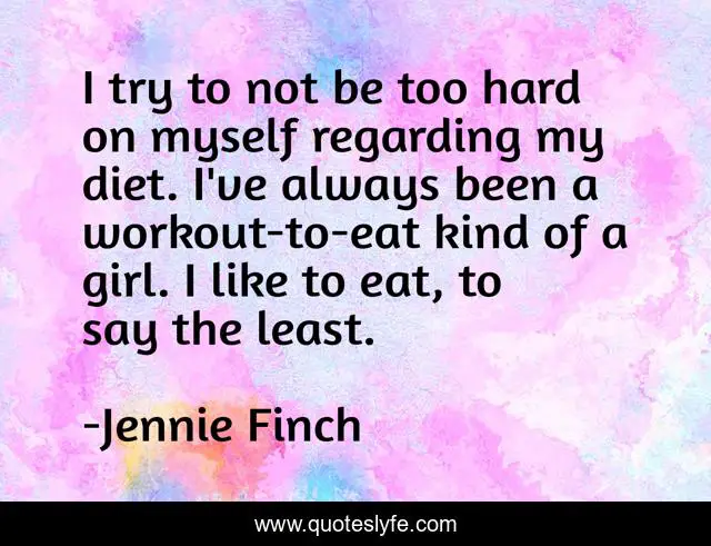This page presents the quote "I try to not be too hard on myself regarding my diet. I've always been a workout-to-eat kind of a girl. I like to eat, to say the least.". Author of this quote is Jennie Finch. This quote is about try, myself, girl,.