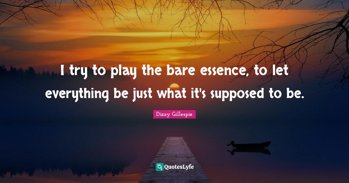 This page presents the quote "I try to play the bare essence, to let everything be just what it's supposed to be.". Author of this quote is Dizzy Gillespie. This quote is about play, trying, essence, supposed to be,.