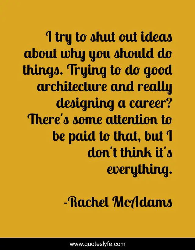 This page presents the quote "I try to shut out ideas about why you should do things. Trying to do good architecture and really designing a career? There's some attention to be paid to that, but I don't think it's everything.". Author of this quote is Rachel McAdams. This quote is about good, ideas, think,.