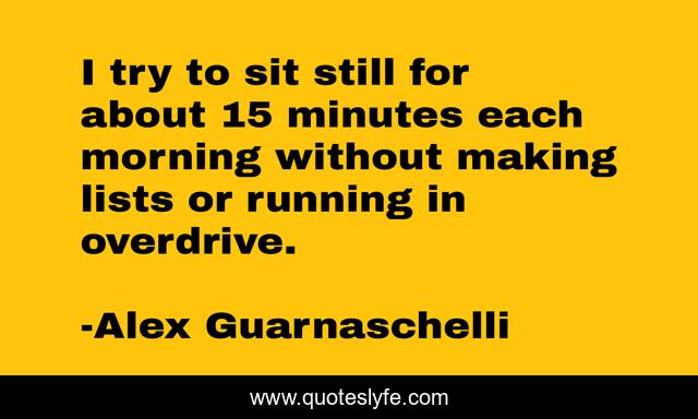 This page presents the quote "I try to sit still for about 15 minutes each morning without making lists or running in overdrive.". Author of this quote is Alex Guarnaschelli. This quote is about try, without, lists,.