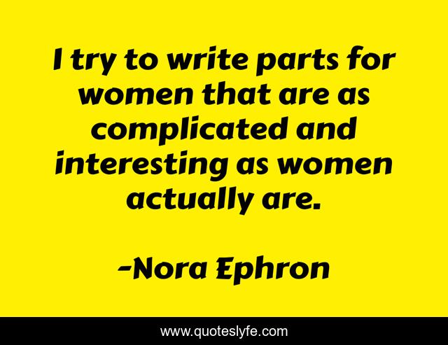 This page presents the quote "I try to write parts for women that are as complicated and interesting as women actually are.". Author of this quote is Nora Ephron. This quote is about try, interesting,.