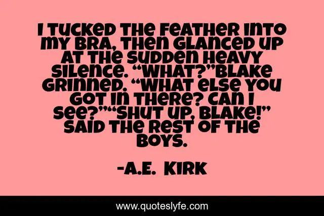 This page presents the quote "I tucked the feather into my bra, then glanced up at the sudden heavy silence. “What?”Blake grinned. “What else you got in there? Can I see?”“Shut up, Blake!” said the rest of the boys.". Author of this quote is A.E. Kirk. This quote is about funny, dead-at-deadnight, comedy, paranormal-romance, shut-up-blake,.
