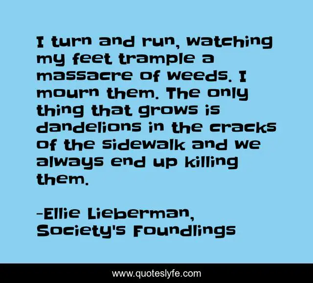 This page presents the quote "I turn and run, watching my feet trample a massacre of weeds. I mourn them. The only thing that grows is dandelions in the cracks of the sidewalk and we always end up killing them.". Author of this quote is Ellie Lieberman, Society's Foundlings. This quote is about dandelions, young-adult-fiction, cracks-in-the-sidewalk, ya, coming-of-age, wishes, weeds,.