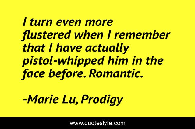 This page presents the quote "I turn even more flustered when I remember that I have actually pistol-whipped him in the face before. Romantic.". Author of this quote is Marie Lu, Prodigy. This quote is about june, day,.