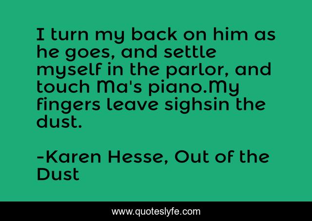 This page presents the quote "I turn my back on him as he goes, and settle myself in the parlor, and touch Ma's piano.My fingers leave sighsin the dust.". Author of this quote is Karen Hesse, Out of the Dust. This quote is about music-expression, loss, piano, change,.