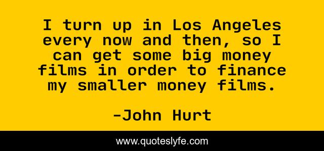 This page presents the quote "I turn up in Los Angeles every now and then, so I can get some big money films in order to finance my smaller money films.". Author of this quote is John Hurt. This quote is about money, i can, los angeles,.