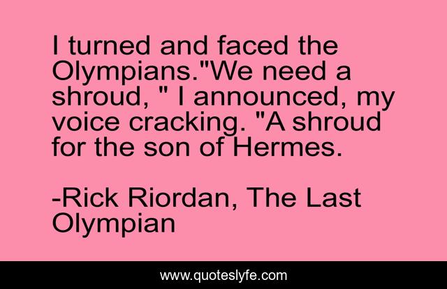 This page presents the quote "I turned and faced the Olympians."We need a shroud, " I announced, my voice cracking. "A shroud for the son of Hermes.". Author of this quote is Rick Riordan, The Last Olympian. This quote is about luke, percy-jackson,.