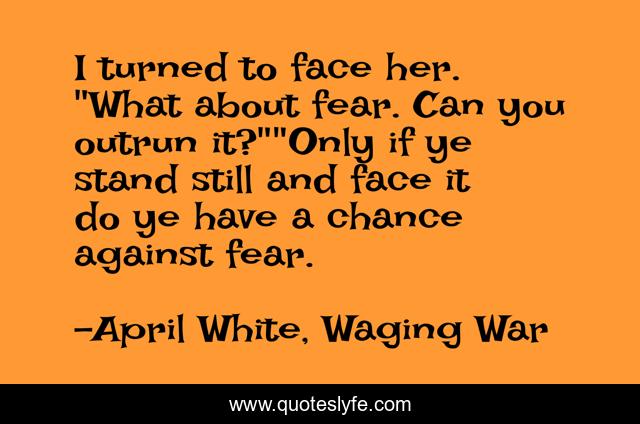 This page presents the quote "I turned to face her. "What about fear. Can you outrun it?""Only if ye stand still and face it do ye have a chance against fear.". Author of this quote is April White, Waging War. This quote is about fear, courage,.