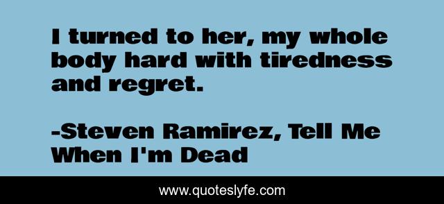 This page presents the quote "I turned to her, my whole body hard with tiredness and regret.". Author of this quote is Steven Ramirez, Tell Me When I'm Dead. This quote is about drunk, novel, dead, zombie-thriller, soldiers, paranormal-thriller, horde, na, hordes,.