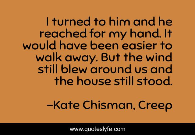 This page presents the quote "I turned to him and he reached for my hand. It would have been easier to walk away. But the wind still blew around us and the house still stood.". Author of this quote is Kate Chisman, Creep. This quote is about stalked, love, hard, horror-story, creepy, stalker, fear, ghosts, creep,.
