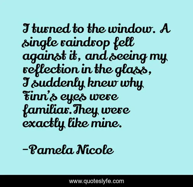 This page presents the quote "I turned to the window. A single raindrop fell against it, and seeing my reflection in the glass, I suddenly knew why Finn’s eyes were familiar.They were exactly like mine.". Author of this quote is Pamela Nicole. This quote is about book, characters,.
