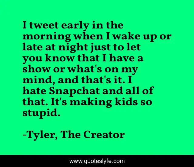 This page presents the quote "I tweet early in the morning when I wake up or late at night just to let you know that I have a show or what's on my mind, and that's it. I hate Snapchat and all of that. It's making kids so stupid.". Author of this quote is Tyler, The Creator. This quote is about hate, stupid, mind,.
