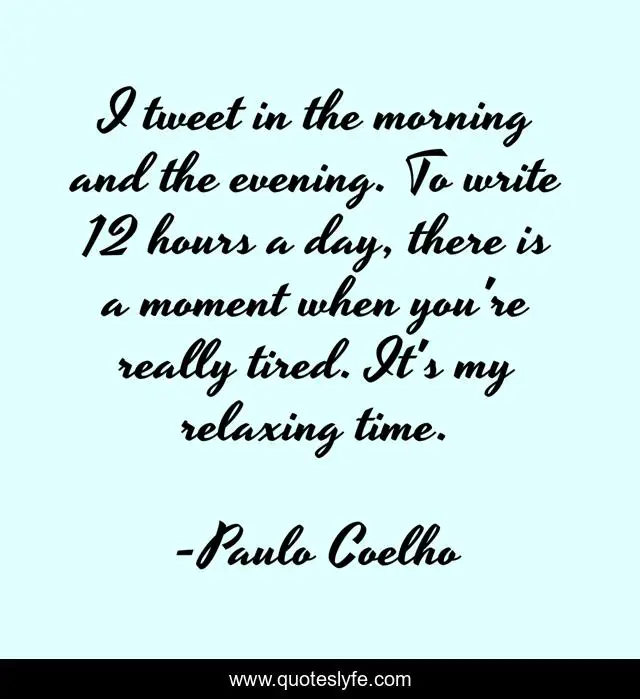 This page presents the quote "I tweet in the morning and the evening. To write 12 hours a day, there is a moment when you're really tired. It's my relaxing time.". Author of this quote is Paulo Coelho. This quote is about time, day, tired,.