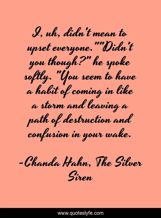 This page presents the quote "I, uh, didn't mean to upset everyone.""Didn't you though?" he spoke softly. "You seem to have a habit of coming in like a storm and leaving a path of destruction and confusion in your wake.". Author of this quote is Chanda Hahn, The Silver Siren. This quote is about confusion, keal, destruction, thalia,.