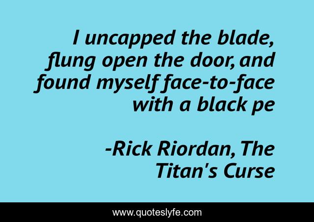This page presents the quote "I uncapped the blade, flung open the door, and found myself face-to-face with a black pe". Author of this quote is Rick Riordan, The Titan's Curse. This quote is about percy-jackson, blackjack,.