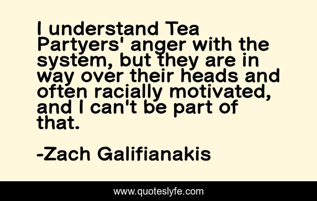 This page presents the quote "I understand Tea Partyers' anger with the system, but they are in way over their heads and often racially motivated, and I can't be part of that.". Author of this quote is Zach Galifianakis. This quote is about tea, understand, way,.