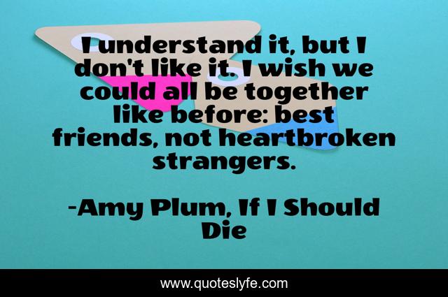 This page presents the quote "I understand it, but I don't like it. I wish we could all be together like before: best friends, not heartbroken strangers.". Author of this quote is Amy Plum, If I Should Die. This quote is about love, heartbreak, love-triangle, affection, love-hurts,.