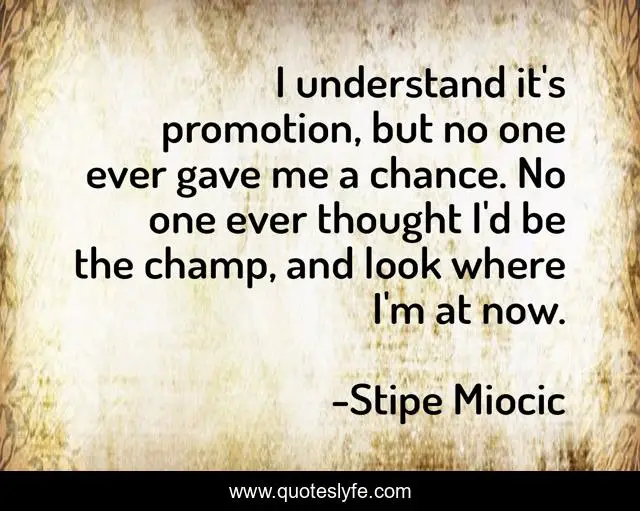 This page presents the quote "I understand it's promotion, but no one ever gave me a chance. No one ever thought I'd be the champ, and look where I'm at now.". Author of this quote is Stipe Miocic. This quote is about thought, me, look,.