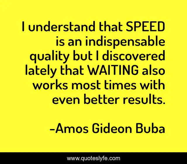 This page presents the quote "I understand that SPEED is an indispensable quality but I discovered lately that WAITING also works most times with even better results.". Author of this quote is Amos Gideon Buba. This quote is about patience, waiting, productivity, inspiration,.