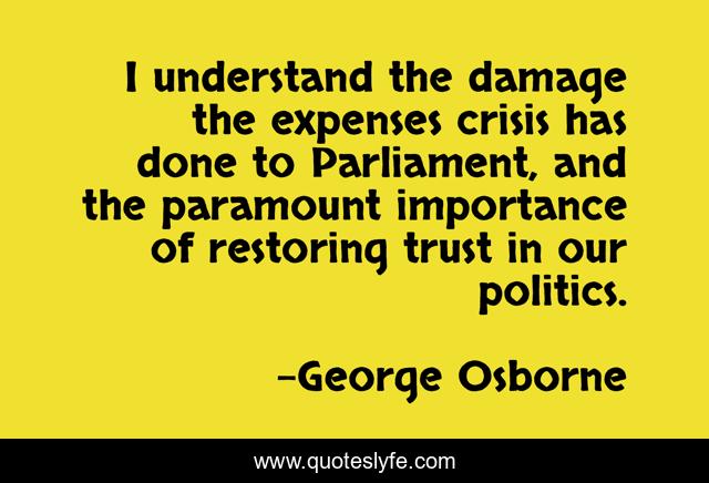 This page presents the quote "I understand the damage the expenses crisis has done to Parliament, and the paramount importance of restoring trust in our politics.". Author of this quote is George Osborne. This quote is about politics, done, crisis,.