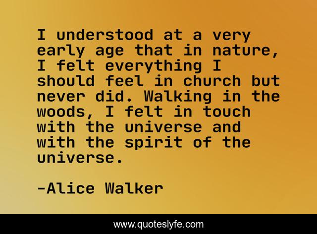 This page presents the quote "I understood at a very early age that in nature, I felt everything I should feel in church but never did. Walking in the woods, I felt in touch with the universe and with the spirit of the universe.". Author of this quote is Alice Walker. This quote is about universe, age, walking,.