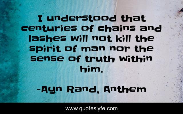 This page presents the quote "I understood that centuries of chains and lashes will not kill the spirit of man nor the sense of truth within him.". Author of this quote is Ayn Rand, Anthem. This quote is about freedom, human-spirit,.
