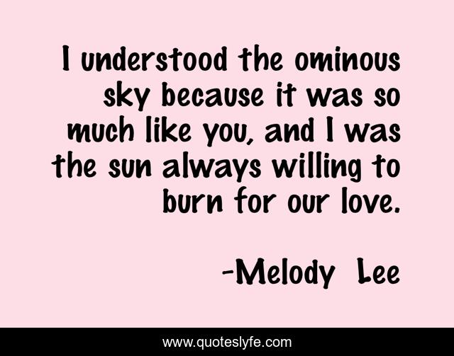 This page presents the quote "I understood the ominous sky because it was so much like you, and I was the sun always willing to burn for our love.". Author of this quote is Melody Lee. This quote is about love, passion, in-love, affection, poetry,.