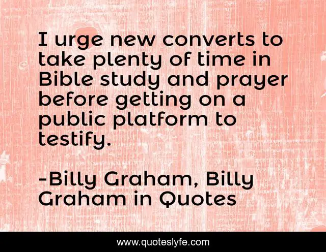 This page presents the quote "I urge new converts to take plenty of time in Bible study and prayer before getting on a public platform to testify.". Author of this quote is Billy Graham, Billy Graham in Quotes. This quote is about billy-graham, testimony,.