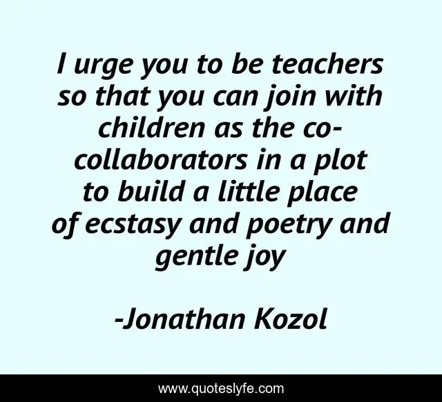 This page presents the quote "I urge you to be teachers so that you can join with children as the co-collaborators in a plot to build a little place of ecstasy and poetry and gentle joy". Author of this quote is Jonathan Kozol. This quote is about early-childhood, education, children, teachers,.