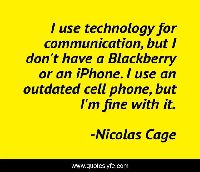 This page presents the quote "I use technology for communication, but I don't have a Blackberry or an iPhone. I use an outdated cell phone, but I'm fine with it.". Author of this quote is Nicolas Cage. This quote is about cell phone, technology,.