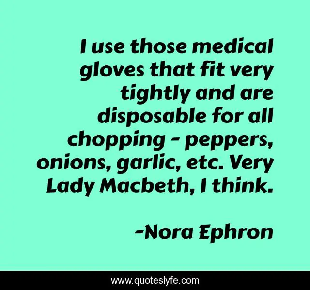This page presents the quote "I use those medical gloves that fit very tightly and are disposable for all chopping - peppers, onions, garlic, etc. Very Lady Macbeth, I think.". Author of this quote is Nora Ephron. This quote is about peppers, lady, think,.