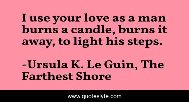 This page presents the quote "I use your love as a man burns a candle, burns it away, to light his steps.". Author of this quote is Ursula K. Le Guin, The Farthest Shore. This quote is about friendship, love, companionship, affection,.