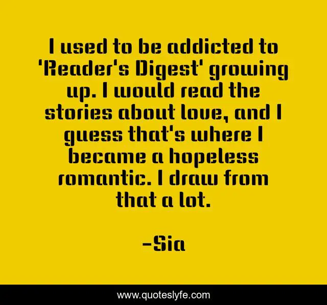 This page presents the quote "I used to be addicted to 'Reader's Digest' growing up. I would read the stories about love, and I guess that's where I became a hopeless romantic. I draw from that a lot.". Author of this quote is Sia. This quote is about growing, love, growing up, affection,.