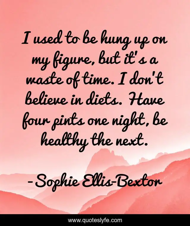 This page presents the quote "I used to be hung up on my figure, but it's a waste of time. I don't believe in diets. Have four pints one night, be healthy the next.". Author of this quote is Sophie Ellis-Bextor. This quote is about believe, time, night,.
